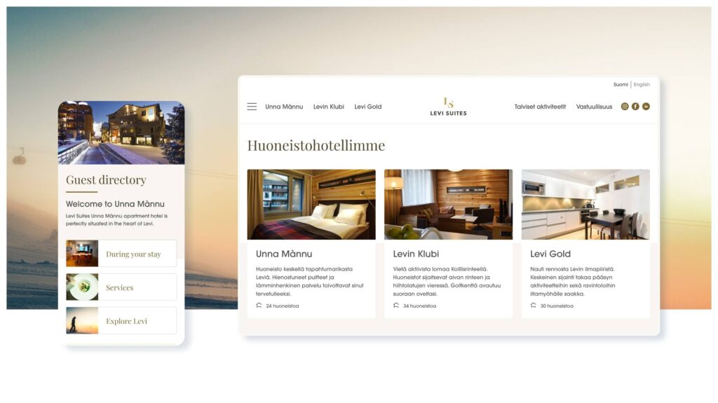 We created a digital apartment folder for the Levi Suites website that digitises paper materials into an always-available format. The room folder is made up of the apartment hotels’ own sub-pages, which contain information about accommodation and services in the area during the customer’s stay. Visitors are directed to the pages of the folder by a physically printed QR code found on the key cards.