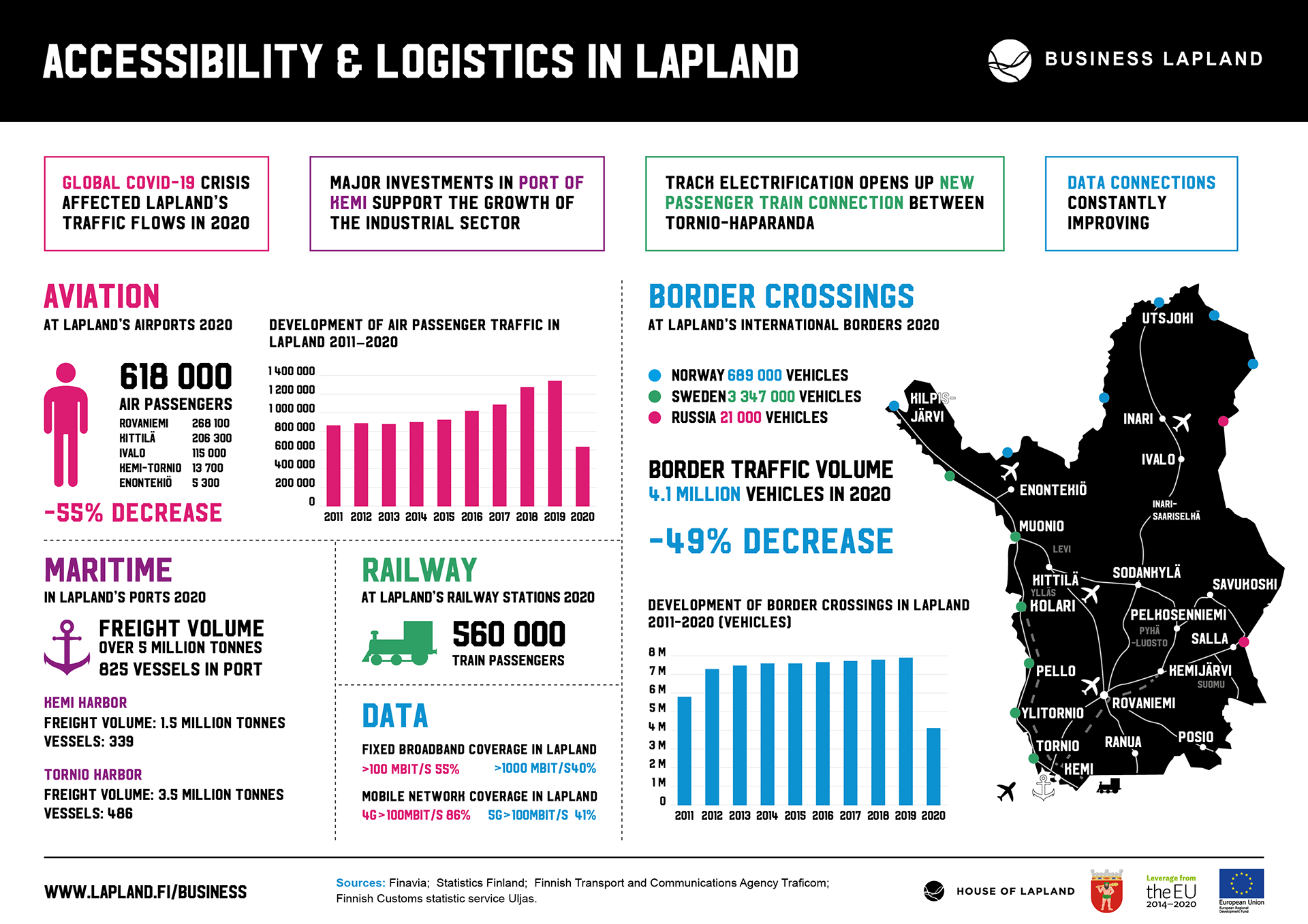 Infografiikan toteutus Lapin matkailun saavutettavuudesta ja matkailun tunnusluvuista. Toteutettu House of Laplandin brändin mukaisesti annettujen tietojen perusteella.
