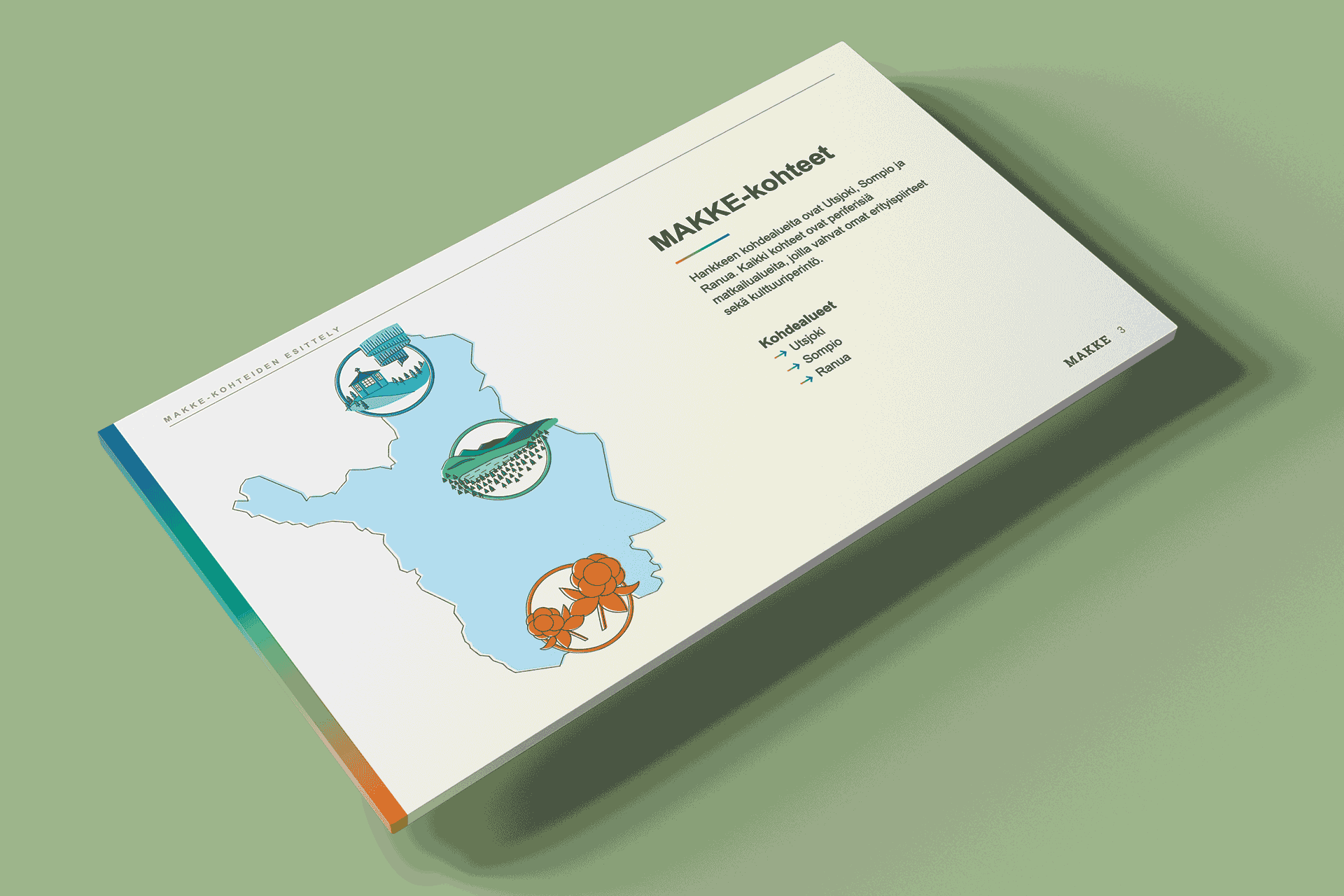 Powerpoint-esitys, infografiikka ja kuvitukset “MAKKE – Matkailualueen kohdekokemuksen kehittämismalli” hankkeelle. Powerpoint-esitys sisälsi työpohjia yrityksille oman kohdekokemuksen kehittämiseen ja analysoimiseen. Karttakuvituksissa esiteltiin Sompion, Utsjoen ja Ranua kuntien yrityksiä, jotka osallistuivat hankkeen kehitysvaiheeseen.