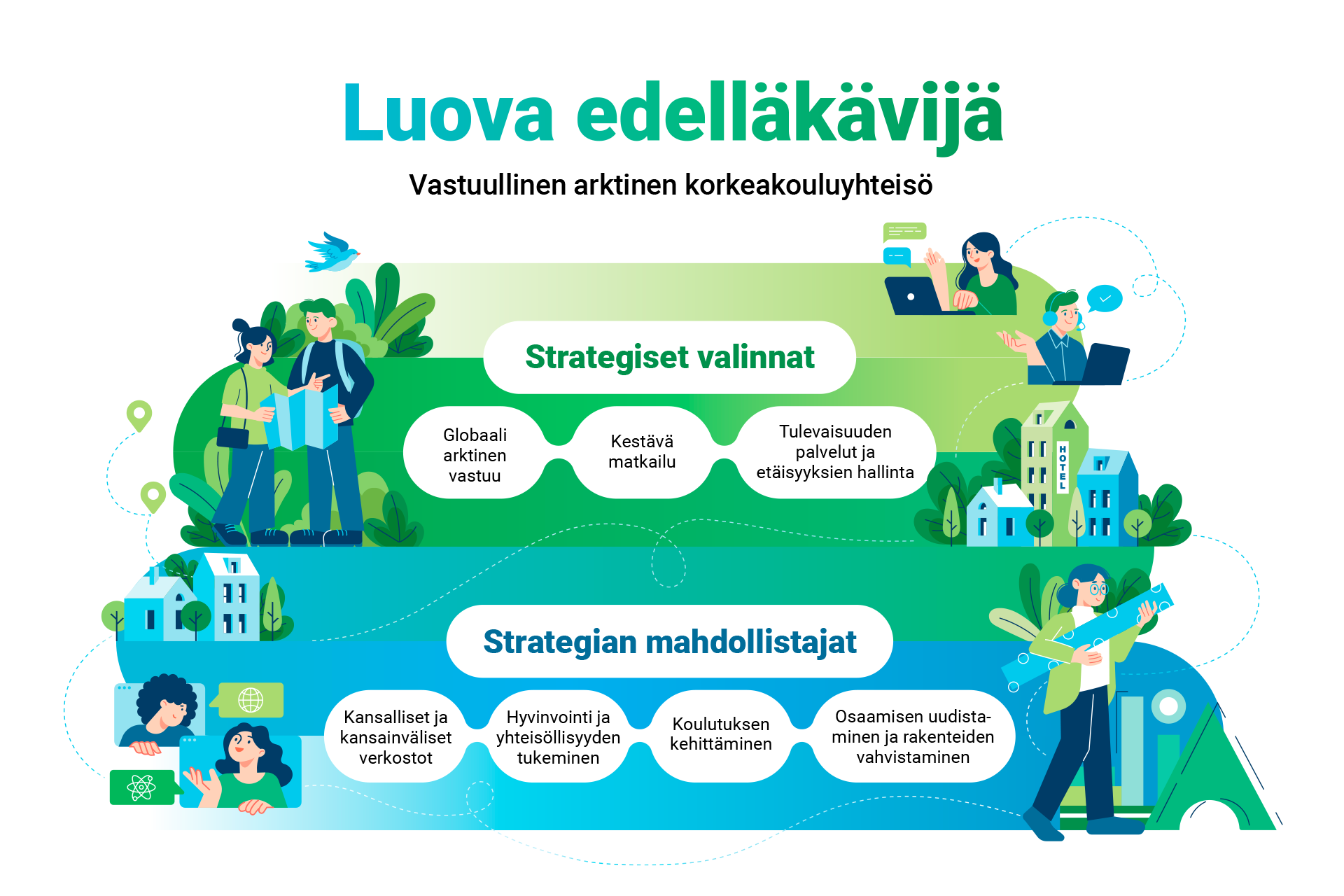 Infografiikka ja kuvitus Lapin korkeakoulukonsernin strategialle 2030 “Luova edelläkävijä – Vastuullinen arktinen korkeakouluyhteisö”. Kuvituksessa otettiin huomioon etenkin kestävän kehityksen ja hiilineutrauliuden arvot korkeakoulukonsernin strategiassa.