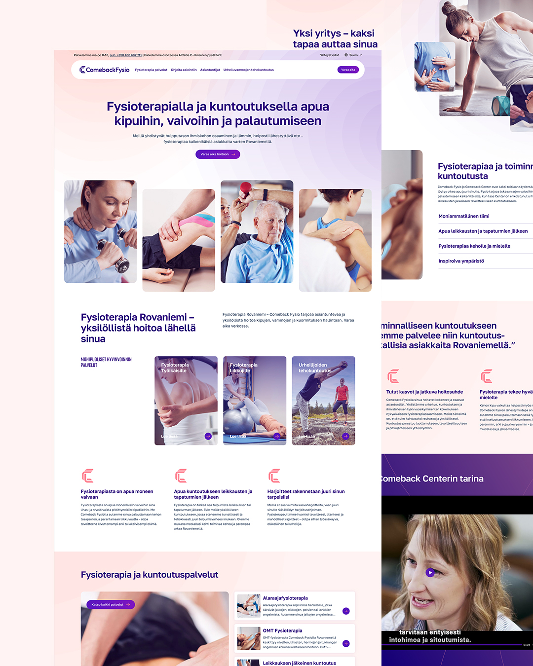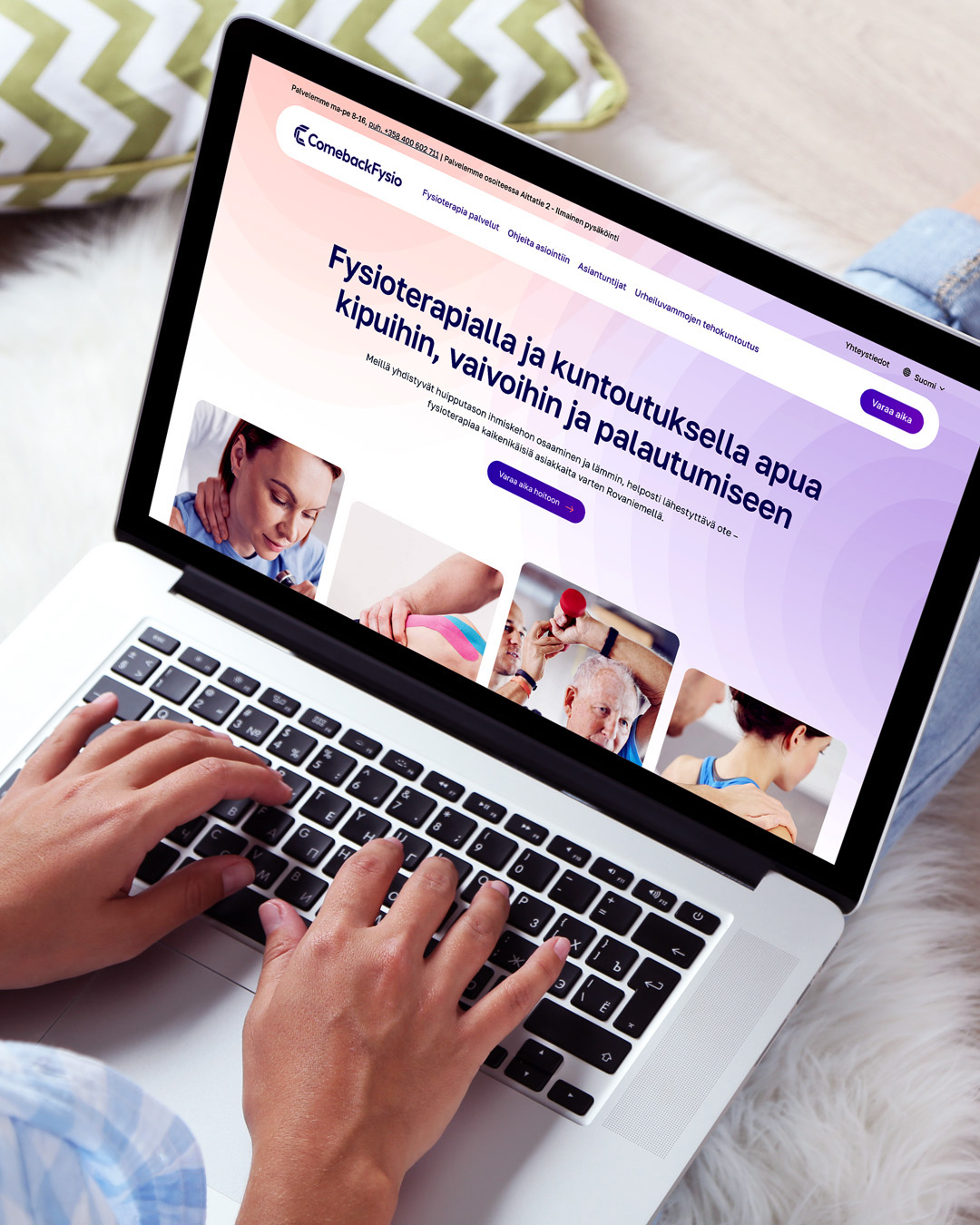 Suunnittelimme ja toteutimme Comeback Fysiolle myös uudistetun verkkosivuston, joka toimii selkeänä palvelukokonaisuutena eri asiakasryhmille sekä ohjaa varaamaan ajan tai ottamaan yhteyttä sujuvasti sivuston kautta. Sivuston rakenne koostuu helppokäyttöisestä navigaatiosta ja erilaisista palvelulistauksista sekä visuaalisista nostoista, jotka tuovat yrityksen palvelut helposti esille.