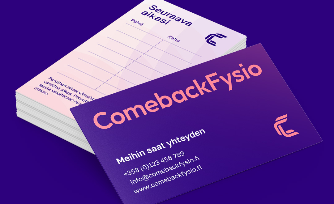 Comeback Fysion visuaalisen ilmeen suunnittelussa haluttiin korostaa paikallista osaamista, syvällistä osaamista urheiluvammojen kuntoutuksesta ja helposti lähestyttävää palveluasennetta. Yritys tarjoaa fysioterapiapalveluita ja kuntoutusta työikäisille sekä tavallisille kuluttajille kuin myös urheiluvammojen tehokuntoutusta ammattiurheilijoille. Yritysilmeestä suunniteltiin visuaalisesti nykyaikainen, selkeä ja värimaailmaltaan sporttisen energinen. Moderni visuaalinen ilme kommunikoi asiakkaille yrityksen arvoista ja asiantuntevasta otteesta yksilöllisten kuntoutuspalvelujen tarjoajana.