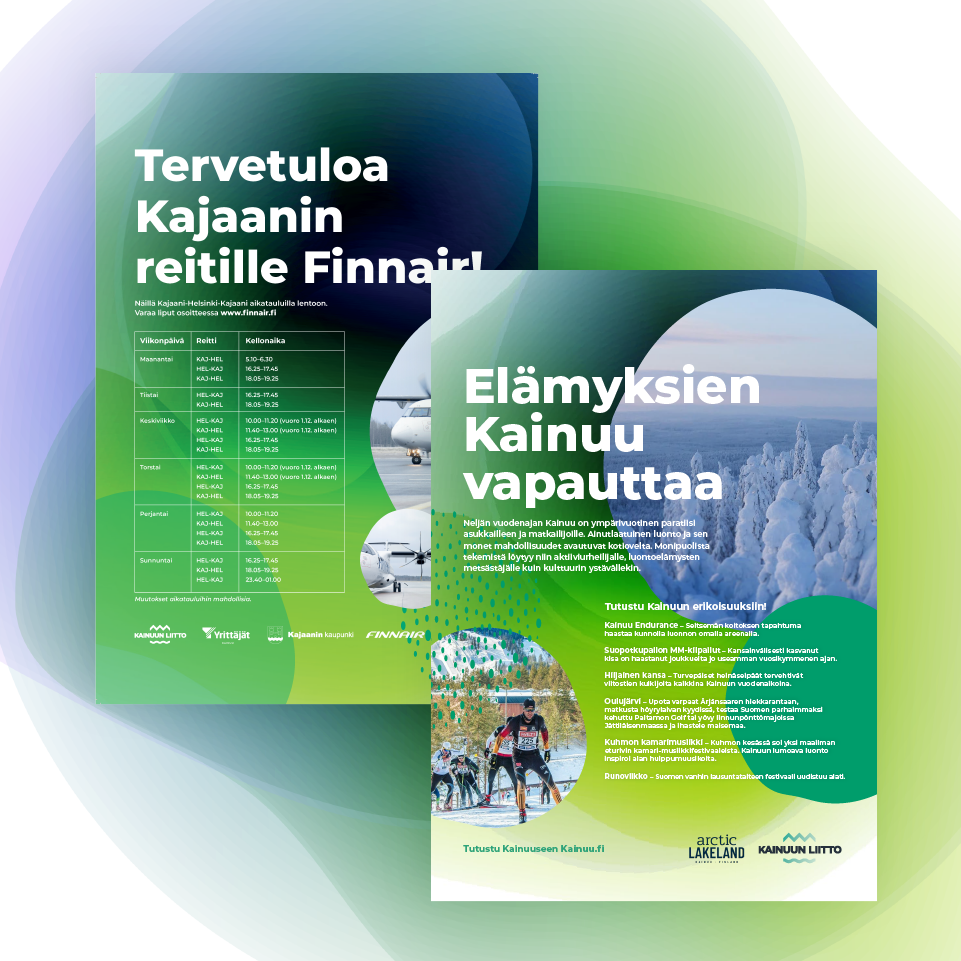 Kainuun markkinointimateriaalien tarkoituksena on edistää maakuntaan muuttoa sekä alueen matkailua. Maakunnan mainostoimistokumppanina Höyry on toteuttanut markkinointimateriaalia erilaisiin kampanjoihin ja tapahtumiin brändiohjeiston mukaisesti – esimerkiksi Kotimaan Matkailumessuille suunnittelimme Kainuulle kangaskassin, postikortteja sekä erilaisia rollupeja. Näiden lisäksi olemme vastanneet erilaisten sosiaalisen median mainosten, esitteiden, klikkibannereiden, lehti-ilmoitusten ja Kainuun verkkosivujen toteutuksesta.
